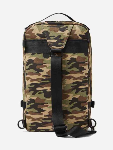 Camouflage print multi-pocket crossbody bag. Strap detail at exterior.